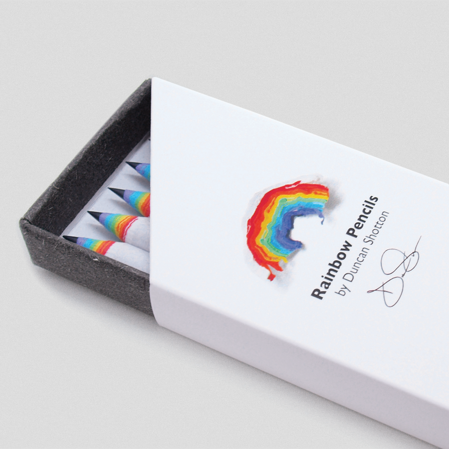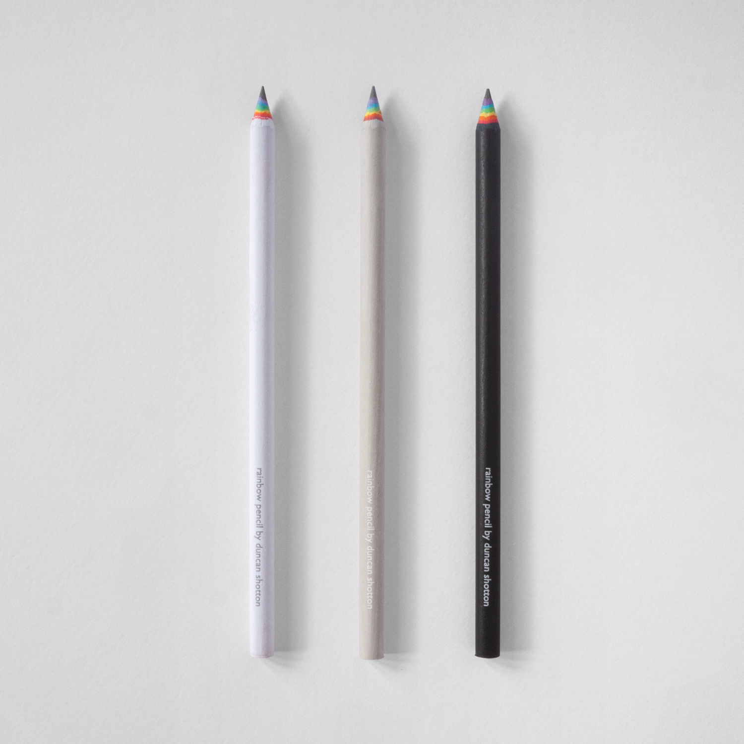 Each pencil is printed with logo on one side and “rainbow pencil by duncan shotton” on the other. The outer (black, white or light grey) layers of each pencil are also made from recycled paper. The finish of each pencil is therefore never ‘perfect’ and will contain marks and imperfections, as is standard of recycled paper.