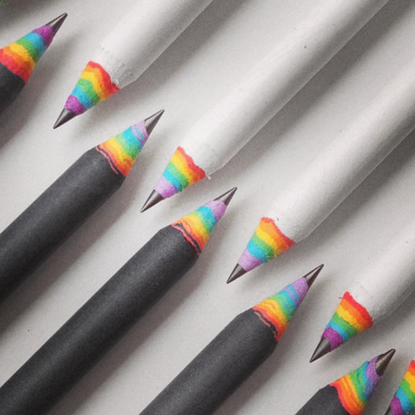 Each pencil has a 6-layer rainbow core and comes finished in either black, white or light grey.