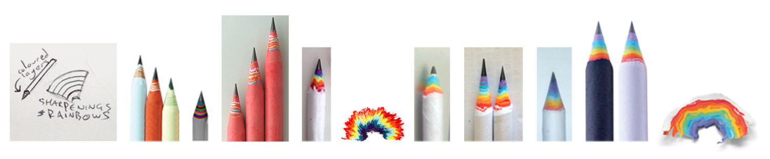 Rainbow Pencils function like regular wooden pencils, and are the same size and weight, but they’re not made from wood, they’re made from lots of layers of recycled waste paper. So the shavings / sharpenings look like rainbows.