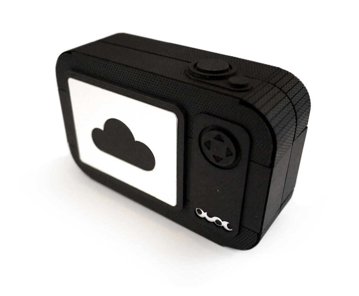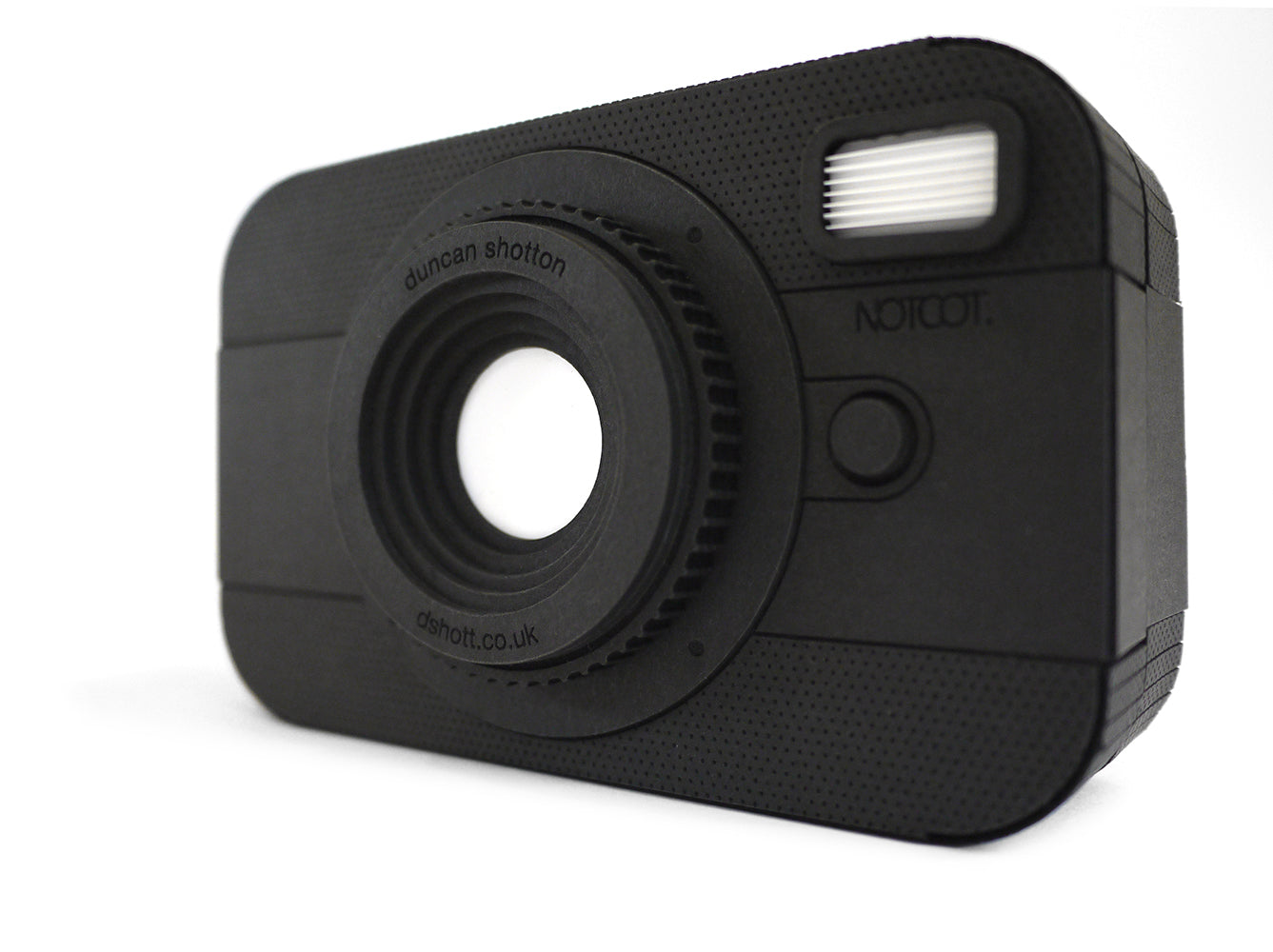 Camera-shaped gift box, constructed entirely from laser etched and laser cut paperboard of various thicknesses, folded and glued together.