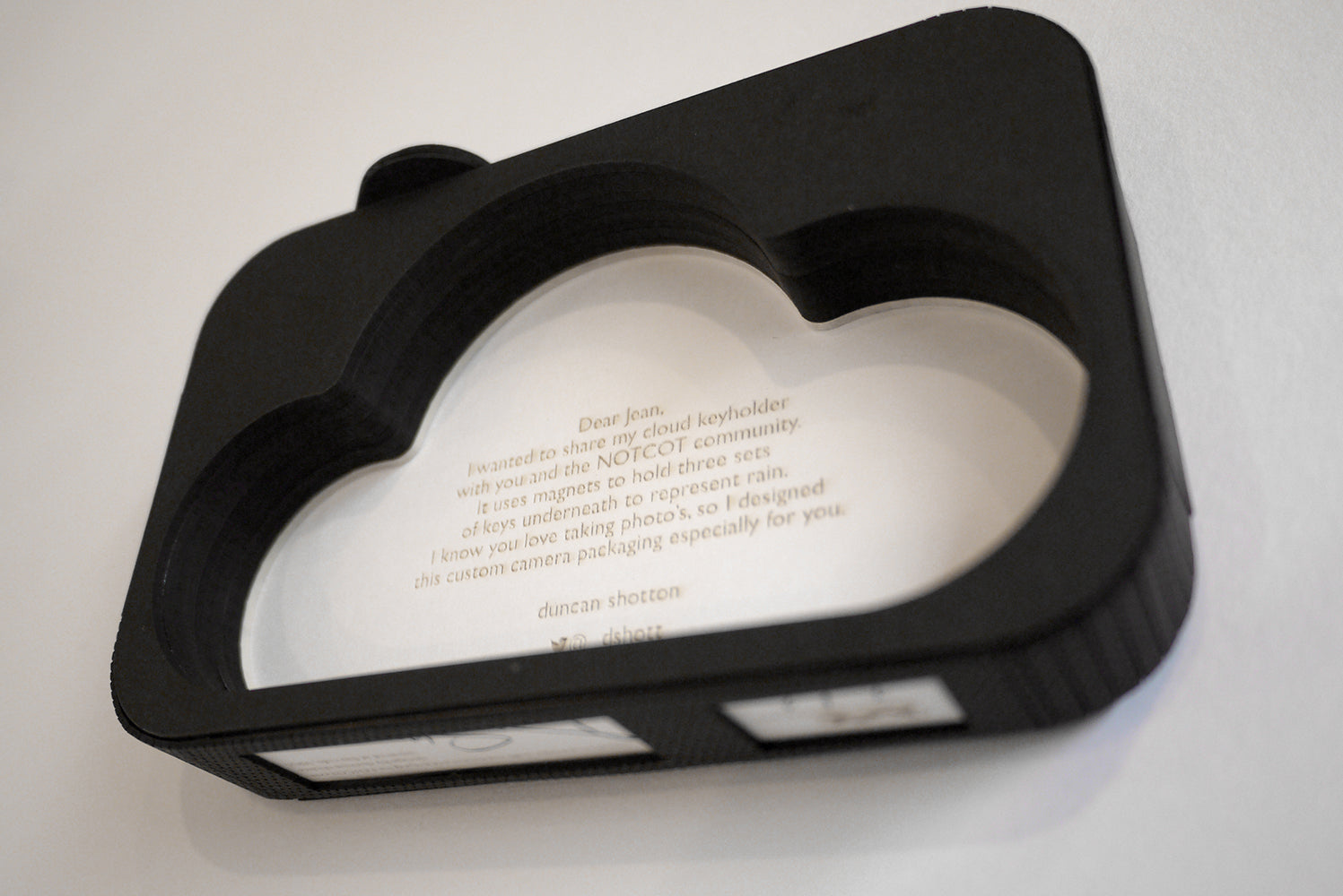 Designed and produced as a one-off for special presentation of one Cloud Keyholder to popular design blog notcot.com, in collaboration with Tokyo’s ‘Fab Cafe’.