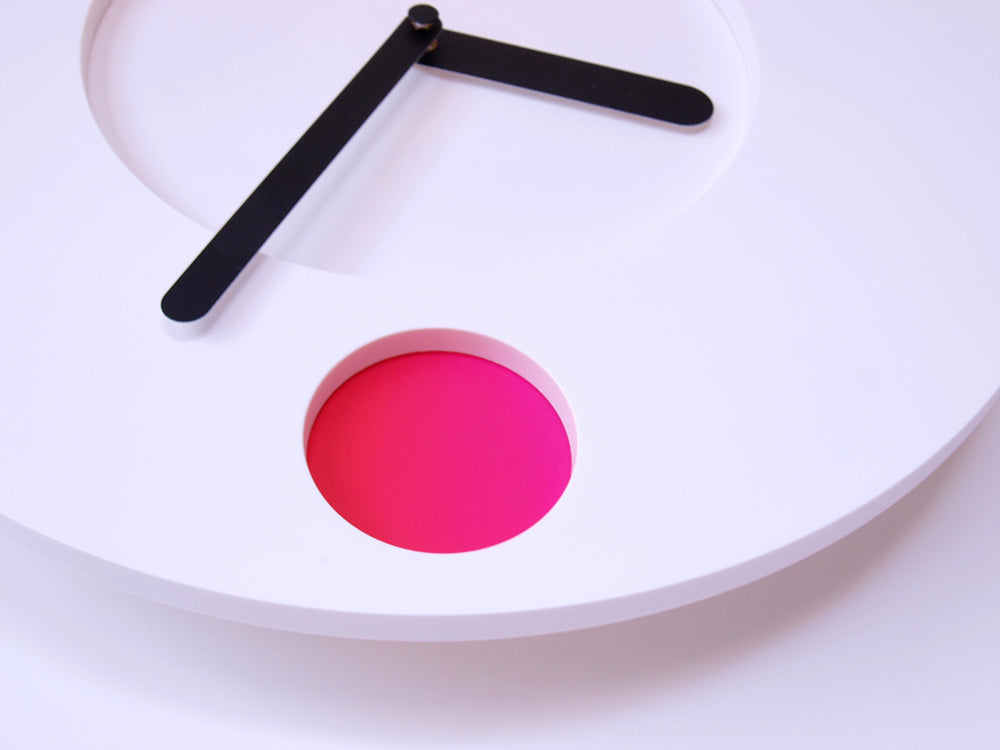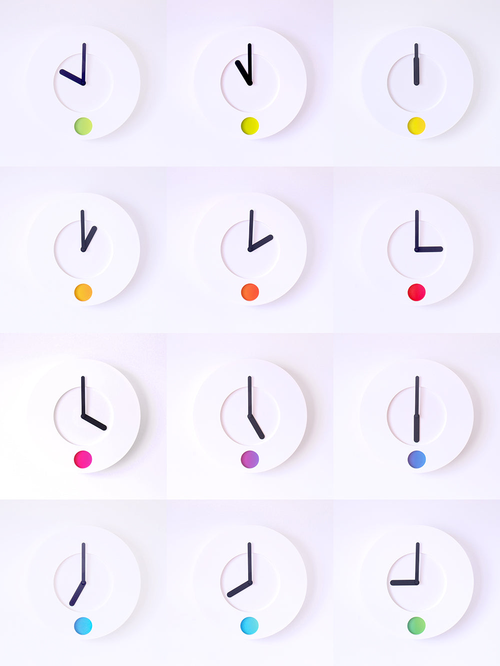 As the seconds, minutes and hours roll steadily by, the colour window glides subtly through the full spectrum of colours, creating a timepiece that adds a more relaxed method of reading the time, not by number, but by colour.