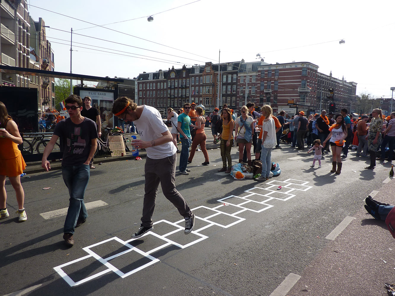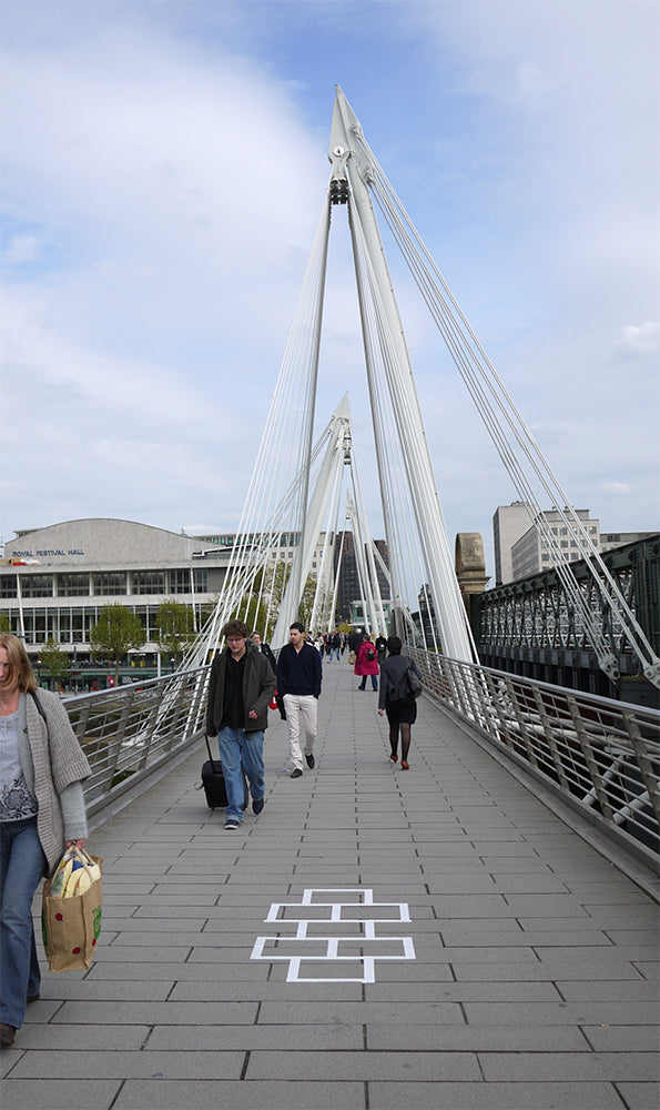 Hopscotch is traditionally played by children in schools, parks and other recreational spaces. Although the exact style and pattern varies around the world, the general form is widely recognised by children and adults alike, and is associated with the idea of play and feeling of happiness.